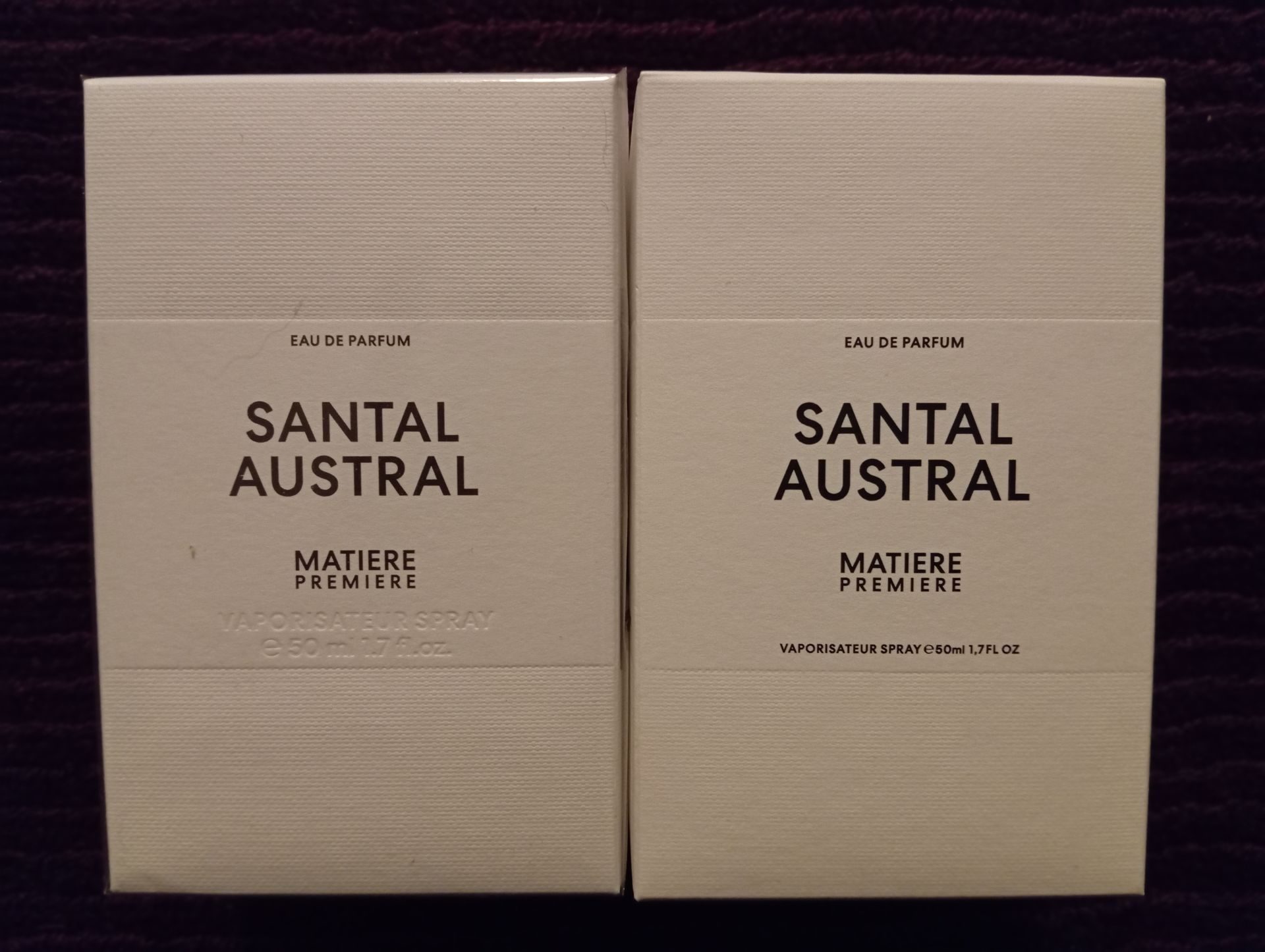 Nový nákup je na Kosmetika zdraví a ten celofán málo přiléhá, i ty rohy jsou takové "odfláklé". Nalákala mě hezká cena a taky jsem tam nedávno kupovala jiný parfém, který mi přijde ok. Nevím, jak to bylo u minulého nákupu Santal austral, ale u tohoto je celofán ohnutý na boku krabičky, ne na spodku a vršku krabičky, jak bývá u jiných parfému zvykem. První nákup Santal austral byl v Ingredients.