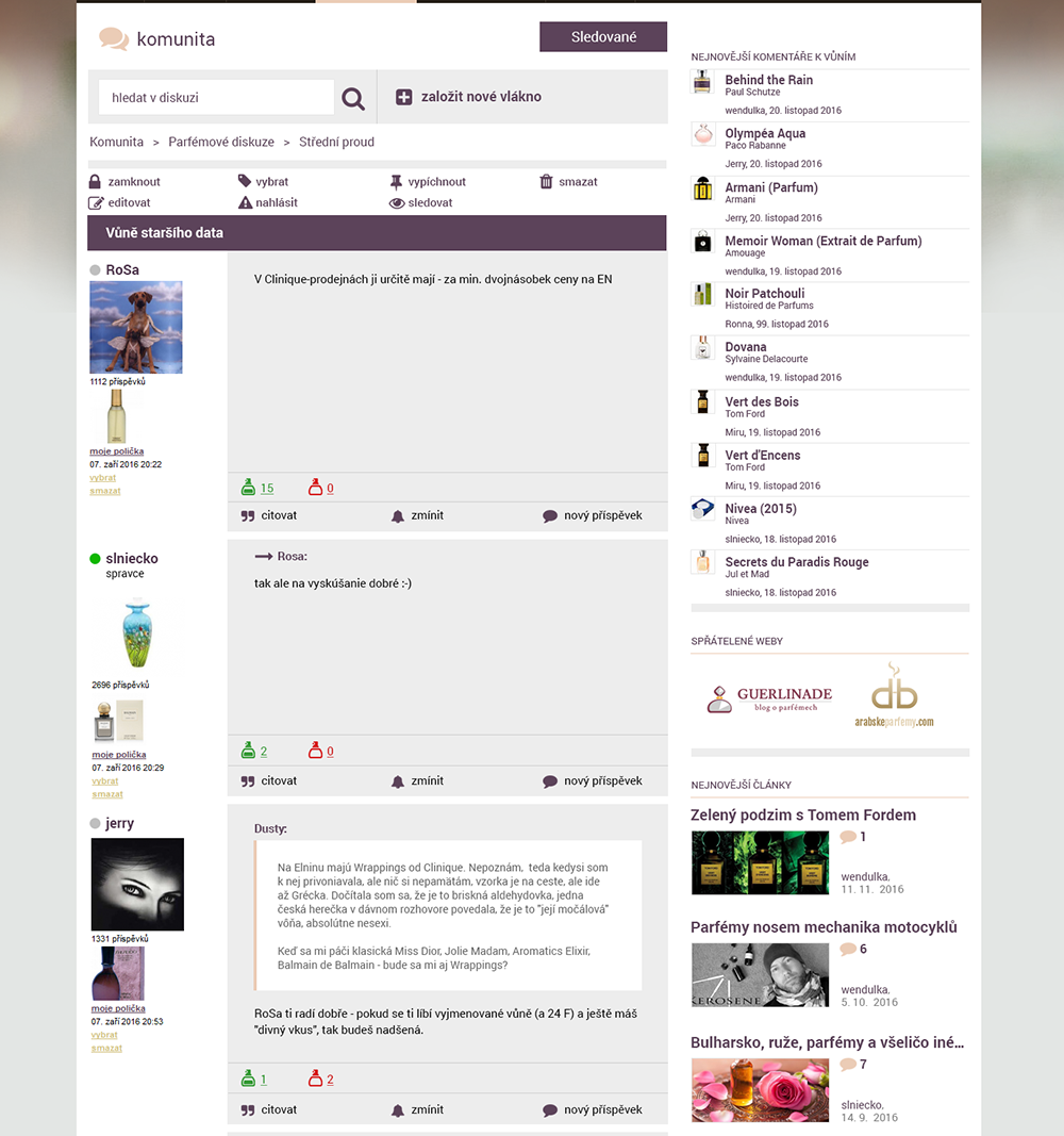 - Drobné opravy a doplňky týkající se propojení s databází: Ikonka “ navoněného“ parfému u příspěvku už by měla mít funkční proklik a také přibude možnost jednoduchým způsobem vložit do příspěvku v textovém editoru odkazy do detailů konkrétních vůní (Něco jako zmínka vůně. Máme pěknou databázi, tak to pěkně propojme. J)